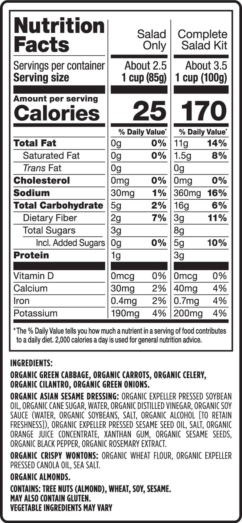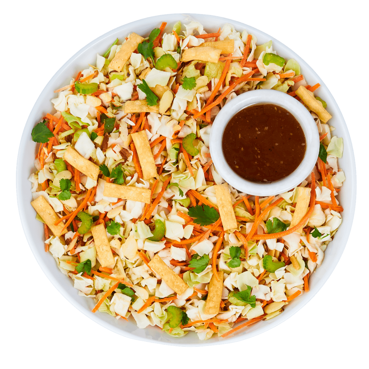 Green Cabbage, Carrots, Celery, Cilantro, Green Onions, Asian Sesame Dressing, Crispy Wontons, Almonds