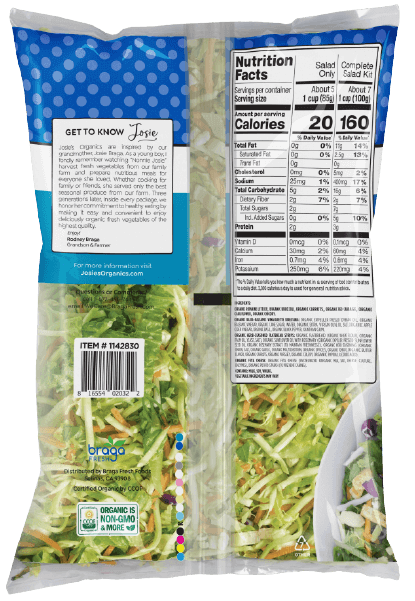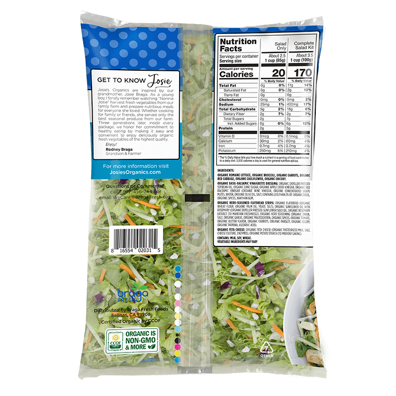 Romaine Lettuce, Broccoli, Carrots, Red Cabbage, Cauliflower, Chicory, Basil-Balsamic Vinaigrette, Herb-Seasoned Flatbread Strips, Feta Cheese