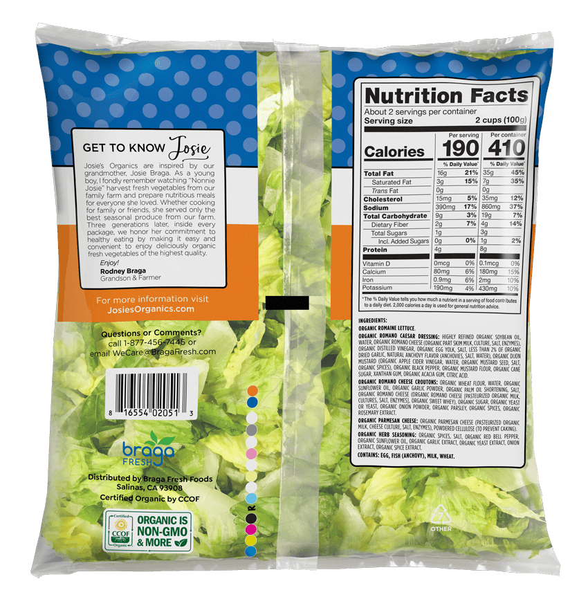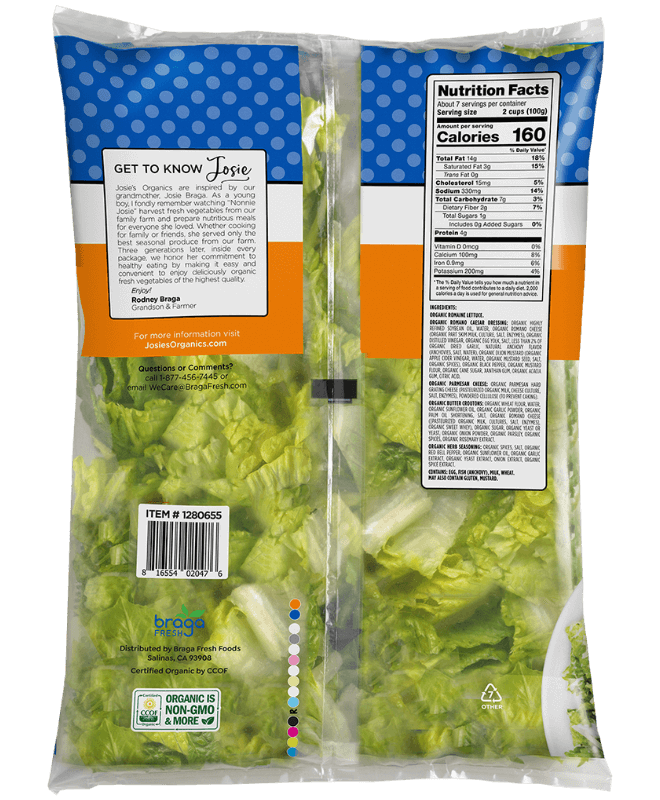Crisp Hearts of Romaine, Cheese Croutons, Parmesan Cheese, Herb Seasoning Packet, Romano Caesar Dressing combine to create the familiar flavors of a favorite salad.